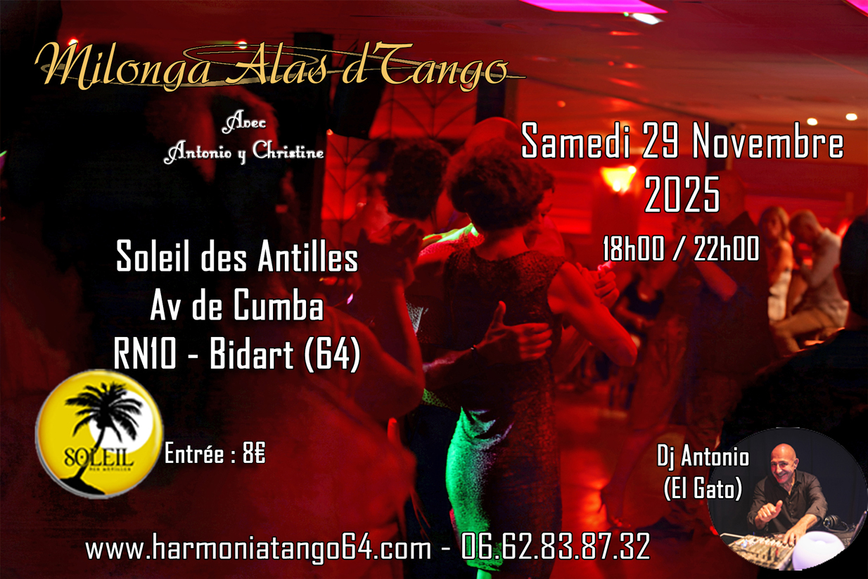 Retrouvons nous pour notre Milonga Alas D'Tango au Soleil des Antilles à Bidart !